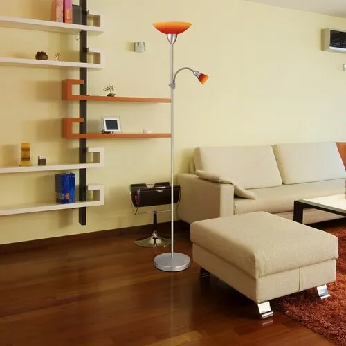 Modern megjelenésű állólámpa külön kapcsolható olvasókarral, 177,5 cm-es magassággal, szatin króm színű fém szerkezettel, piros-narancs színű üvegbúrákkal. Az állólámpa felső lámpateste E27-es foglalatban maximum 100W teljesítményű, olvasókarja E14-es foglalatban maximum 40W teljesítményű halogén és energiatakarékos LED fényforrással is üzemeltethető. Kialakításának köszönhetően a fényforrások cseréje és a lámpatest tisztítása könnyen és egyszerűen elvégezhető.