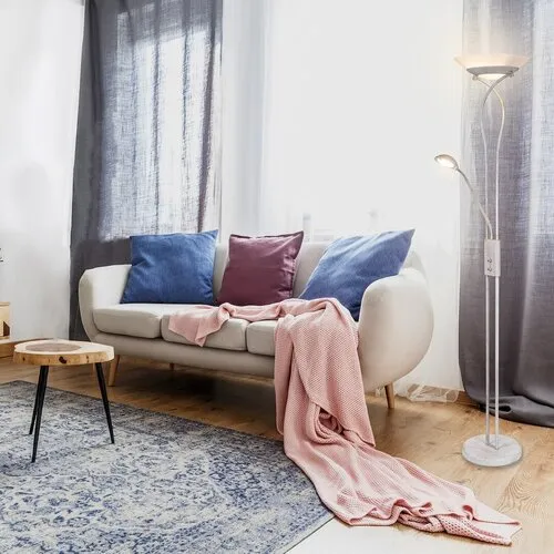 Vintage stílusú állólámpa 2 db foglalattal és olvasókarral. 174 cm magas, 32 cm átmérőjű, antik fehér színű fém lámpatest. Fehér üveg lámpabúrával, kapcsolóval és IP20-as védettséggel rendelkezik. A lámpatest E27-es foglalatkialakítású, 2x max. 15W teljesítményű, kizárólag energiatakarékos izzókkal üzemeltethető. Az állólámpa olvasókarja G9-es foglalatkialakítású, max. 40W teljesítményű energiatakarékos izzóval használható.