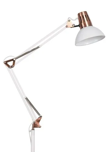 Indusztriális stílusú, állítható magasságú állólámpa 1 db foglalattal. Max. 171,5 cm magas fém szerkezet és pozícionálható lámpabúra, matt fehér és vörösréz színben, vezetékes kapcsolóval, IP20-as védettséggel. A lámpatest E-27-es foglalatkialakítású, max. 40W teljesítményű energiartakarékos izzóval is használható.