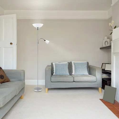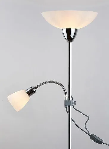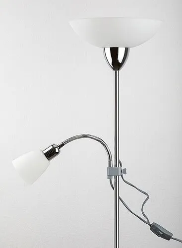 Időtlen megjelenésű állólámpa külön kapcsolható olvasókarral, 177,5 cm-es magassággal, króm színű fém szerkezettel, fehér opálüveg és műanyag lámpabúrákkal. Az állólámpa felső lámpateste E27-es foglalatban G45-ös formájú, maximum 60W teljesítményű, olvasókarja E14-es foglalatban maximum 40W teljesítményű kompakt és energiatakarékos LED fényforrással is üzemeltethető. Kialakításának köszönhetően a fényforrások cseréje és a lámpatest tisztítása könnyen és egyszerűen elvégezhető.