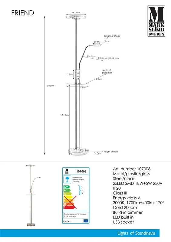 MARKSLÖJD FRIEND Beltéri LED állólámpa 18W+5W 1700lm szürke