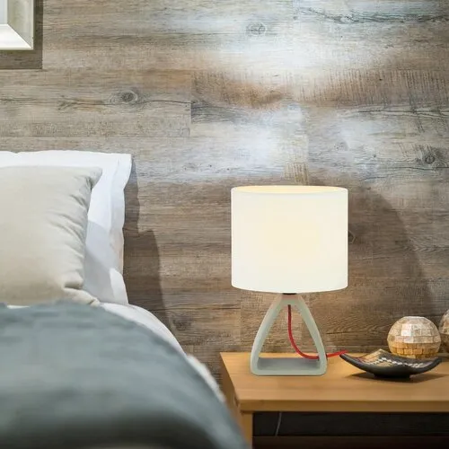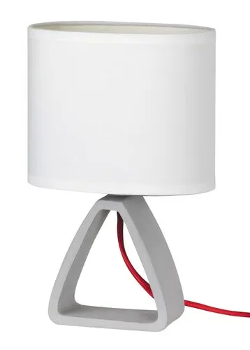 Industrial megjelenésű éjjeli lámpa 1 db foglalattal. 27 cm magas, 17 cm átmérőjű beton lámpatest és fehér színű textil lámpaernyő, piros vasalózsinór vezetékes kapcsolóval. Az asztali lámpa E14-es foglalattípusú, max. 40W teljesítményű fényforrással használható.