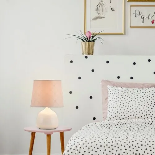 Időtlen megjelenésű éjjeli lámpa 1 db foglalattal, vezetékes kapcsolóval. 26 cm magas, 18 cm átmérőjű, bézs színű kerámia lámpatest és bézs alapszínű, halvány rácsmintás textil lámpaernyő. Az asztali lámpa E14-es foglalatú, max. 40W teljesítményű energiatakarékos fényforrással is használható.