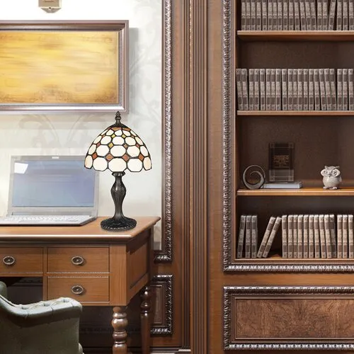 A Tiffany lámpabúrás éjjeli lámpa, egyedi, kézzel készült termék, amely remek választás, ha a klasszikus elegancia mellett egyedülálló, különleges darabot keres. Technikai adatai: Tiffany lámpabúrás asztali lámpa 1 db foglalattal. 36,5 cm magas és 20 cm átmérőjű, bronz színű fémből készített lámpatest színes Tiffany-stílusú üveg lámpabúrával, IP20-as védelemmel. A lámpatest E-14-es foglalatú, max. 40W teljesítményű halogén vagy energiatakarékos fényforrással használható.