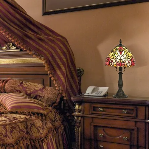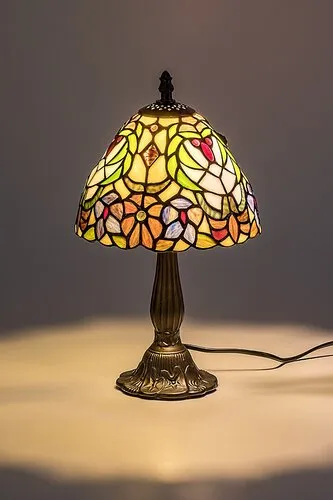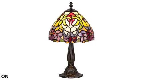 A Tiffany lámpabúrás mennyezeti lámpa, egyedi, kézzel készült termék, amely remek választás, ha a klasszikus elegancia mellett egyedülálló, különleges darabot keres. Technikai adatai: Tiffany lámpabúrás asztali lámpa 1 db foglalattal. 35 cm magas, 20 cm átmérőjű, bronz színű fémből készített lámpatest színes Tiffany-stílusú üveg lámpabúrával. A lámpatest E-14-es foglalatú, max. 40W teljesítményű energiatakarékos fényforrással is használható.