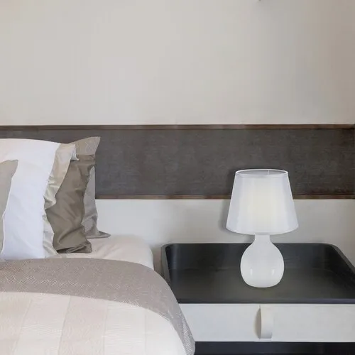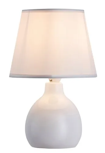 Időtlen megjelenésű éjjeli lámpa 1 db foglalattal. 28 cm magas, 17 cm átmérőjű lámpatest krém színű kerámia lámpatesttel és textil lámpaernyővel, vezetékes kapcsolóval és IP20-as védettséggel. Az asztali lámpa E-14-es foglalatkialakítású, max. 40W teljesítményű izzóval használható.
