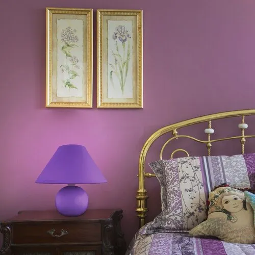 Hangulatvilágítást biztosító, időtlen stílusú éjjeli lámpa. Lila színű, kerámiából készített lámpatesttel és textil lámpabúrával, hálózati vezetékkel és kapcsolóval, 19 cm-es magassággal, 20 cm-es átmérővel. A lámpatest max. 40W teljesítményű, E14-es foglalatú, halogén és LED fényforrással használható.