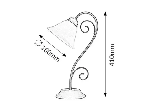 41 cm magas, klasszikus megjelenésű éjjeli lámpa, matt fekete színű, kovácsoltvas jellegű, fém lámpatesttel, fehér alabástromüvegbúrával. E14-es foglalatú, maximum 40W teljesítményű, halogén vagy LED fényforrással is használható. Kialakításának köszönhetően a fényforrás cseréje, illetve a lámpatest tisztítása gyorsan és egyszerűen elvégezhető.