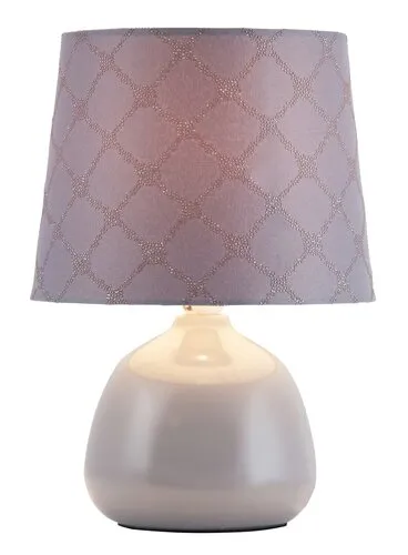 Időtlen megjelenésű éjjeli lámpa 1 db foglalattal, vezetékes kapcsolóval. 26 cm magas, 18 cm átmérőjű, szürke színű kerámia lámpatest és szürke alapszínű, halvány rácsmintás textil lámpaernyő. Az asztali lámpa E14-es foglalatú, max. 40W teljesítményű energiatakarékos fényforrással is használható.