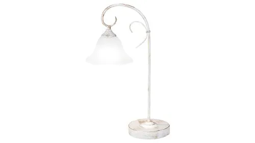 Vintage stílusú éjjeli lámpa 1 db foglalattal, vezetékes kapcsolóval. 52 cm magas, 33,5 cm széles, antik fehér színű fémből készített lámpatest alabástromüveg lámpabúrával. Az asztali lámpa E-27-es foglalatú, max. 40W teljesítményű energiatakarékos fényforrással is használható.