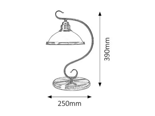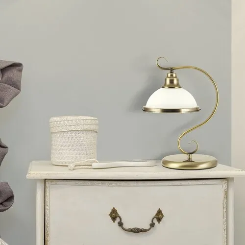 Klasszikus megjelenésű éjjeli lámpa 1 darab foglalattal. 25 cm széles, 39 cm magas, bronz színű fémből készített lámpatest és fehér színű üveg lámpabúra. A lámpatest E27-es foglalatú, max. 60W teljesítményű, halogén vagy energiatakarékos fényforrással is használható.