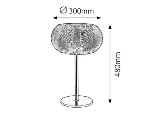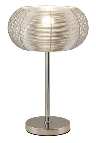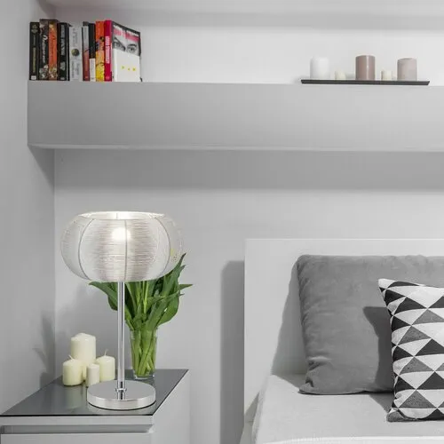 Exkluzív megjelenésű éjjeli lámpa 1 db foglalattal. 48 cm magas, 30 cm búraátmérőjű, ezüst színű fémből készített test és lámpabúra. A lámpatest E27-es foglalatkialakítású, max. 60W teljesítményű energiatakarékos LED fényforrásokkal is használható.