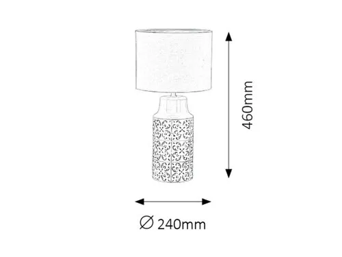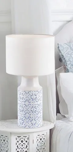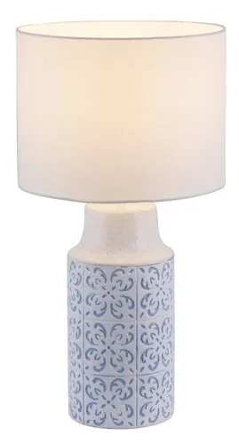 Vintage stílusú éjjeli lámpa 1 db foglalattal. 46 cm magas, fehér alapon kék mintás kerámia lámpatest 24 cm átmérőjű textil lámpaernyővel, vezetékes kapcsolóval. Az asztali lámpa E27-es foglalatkialakítású, max. 60W teljesítményű fényforrással használható.