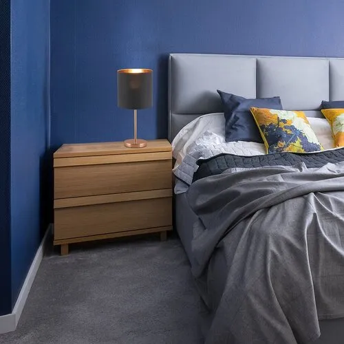 Modern megjelenésű éjjeli lámpa 1 db foglalattal. 43 cm magas, króm színű fém lámpatest 18 cm átmérőjű, szürke és arany színkombinációjú textil lámpabúrával, vezetékes kapcsolóval. A lámpatest E27-es foglalatkialakítású, max. 60W teljesítményű fényforrással használható.