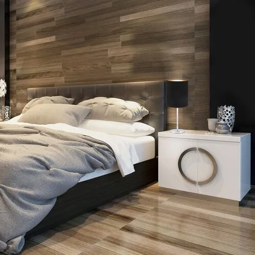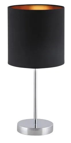 Modern megjelenésű éjjeli lámpa 1 db foglalattal. 43 cm magas, króm színű fém lámpatest 18 cm átmérőjű, fekete és arany színkombinációjú textil lámpabúrával, vezetékes kapcsolóval. A lámpatest E27-es foglalatkialakítású, max. 60W teljesítményű fényforrással használható.