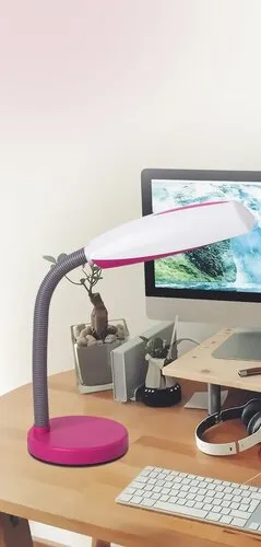 Időtlen megjelenésű asztali lámpa kisebb munkaterület megvilágításához. Műanyag lámpatest rózsaszín és fehér színben, 35 cm-es magassággal, vezetékes kapcsolóval. A lámpatest E27-es foglalatban, max. 15W teljesítményű fényforrással működik, azaz kizárólag energiatakarékos fényforrással használható!