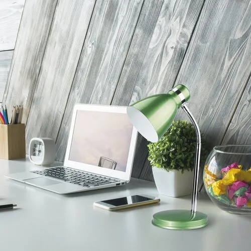 Praktikus íróasztali megvilágítást biztosító asztali lámpa. 32 cm magas, fémből készített, zöld és króm színű lámpatest, zöld színű, pozícionálható lámpabúrával, hálózati vezetékkel és kapcsolóval. A lámpatest max. 40W teljesítményű, E14-es foglalatú, halogén és energiatakarékos fényforrással is használható.