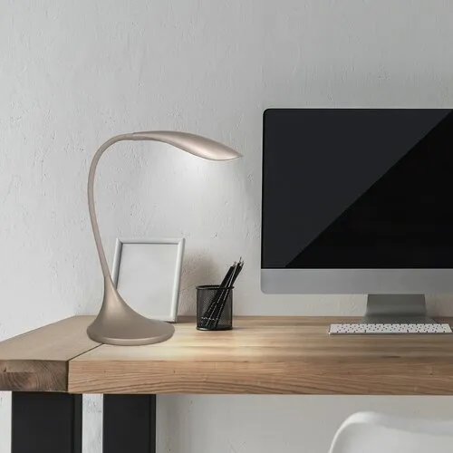 Modern megjelenésű asztali lámpa beépített energiatakarékos LED fényforrással és 3 fokozatban állítható, érintőkapcsolós fényerősségszabályozóval. 52 cm magas, 32 cm széles, pezsgő színű műanyag lámpatest és műanyag lámpabúra. A beépített LED-es lámpa teljesítménye 4,5 W, melyhez 480 lumen fényerő társul. Színhőmérséklete melegfehér (3000 Kelvin). 5 év garanciával. A lámpatestben elhelyezett fényforrás nem cserélhető.