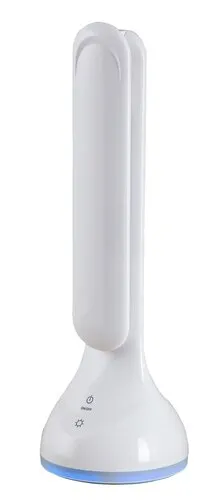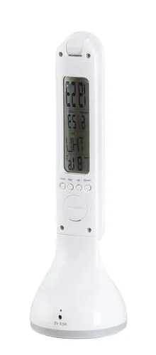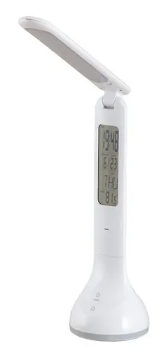 Exkluzív megjelenésű, érintőkapcsolós asztali okoslámpa beépített energiatakarékos LED fényforrással, LCD kijelzővel és kényelmi funkciókkal: dátum, idő, hőmérséklet kijelzéssel, ébresztő, emlékeztető és visszaszámláló funkcióval. 22 cm széles, 26,3 cm magas, fehér színű, műanyagból készített lámpatest és pozícionálható lámpa, beépített, USB kábellel tölthető akkumulátorral. A lámpatest talpában elhelyezett RGB LED változtatható színű hangulatvilágítást nyújt. A búrába beépített LED teljesítménye 4 W, melyhez 253 lumen fényerő társul. Színhőmérséklete természetes fehér (4000 Kelvin). 5 év garanciával. A lámpatestben a fényforrások nem cserélhetők.