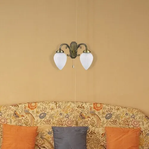 Klasszikus megjelenésű, húzókapcsolós falikar 2 darab foglalattal. 38.5 cm széles és 18 cm magas, bronz színű fémből készített lámpatest fehér opálüveg lámpabúrákkal. A lámpatest E14-es foglalatú, max. 2x40W teljesítményű halogén vagy energiatakarékos, LED fényforrásokkal használható.