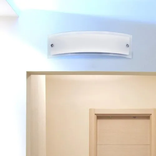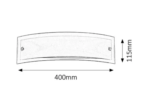 Modern stílusú fali lámpa 2 db foglalattal és beépített kapcsolóval. 40 cm széles, 11,5 cm magas, szatin króm színű, fém test és íves, opálfehér üveg lámpabúra szatin króm színű rögzítőcsavarokkal. A lámpatest E14-es foglalatkialakítású, max. 2x 40W teljesítményű energiatakarékos fényforrásokkal is használható.