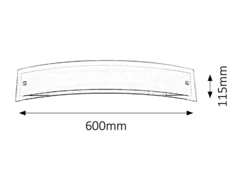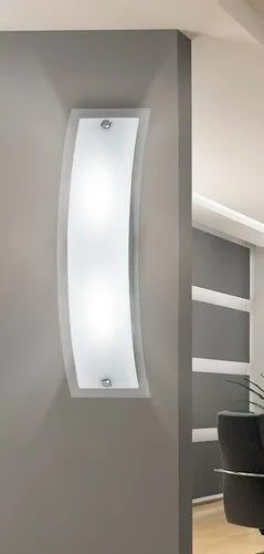 Modern stílusú fali lámpa 3 db foglalattal és beépített kapcsolóval. 60 cm széles, 11,5 cm magas, szatin króm színű, fém test és íves, opálfehér üveg lámpabúra szatin króm színű rögzítőcsavarokkal. A lámpatest E14-es foglalatkialakítású, max. 3x 40W teljesítményű energiatakarékos fényforrásokkal is használható.