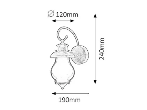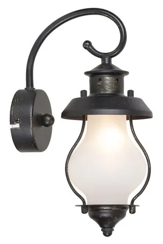 Klasszikus stílusú, rusztikus megjelenésű fali lámpa 1 db foglalattal. 24 cm magas, 19 cm kinyúlású, antik arany színű fémből készített lámpatest fehér színű üveg lámpabúrával. A lámpatest E-14-es foglalatú, C37-es típusú, azaz klasszikus gyertya formájú, energiatakarékos LED fényforrással is használható.