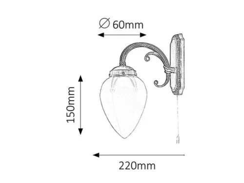Klasszikus megjelenésű, húzókapcsolós falikar 1 darab foglalattal. A faltól mért távolsága 22 cm. A bronz színű fémből készített lámpatest 15 cm magas, 6 cm átmérőjű, lámpabúrája fehér opálüveg. A lámpatest E14-es foglalatú, max. 40W teljesítményű halogén vagy energiatakarékos fényforrással használható.