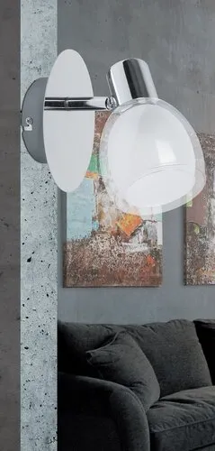 Modern megjelenésű fali spotlámpa 1 db foglalattal és beépített kapcsolóval. 15 cm magas, króm színű fém lámpatest valamint fehér és áttetsző színkombinációjú üveg lámpabúra. A lámpatest E-14-es foglalatú, max. 40W teljesítményű energiatakarékos fényforrással is használható.