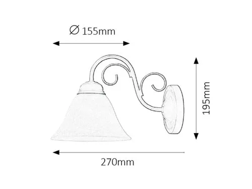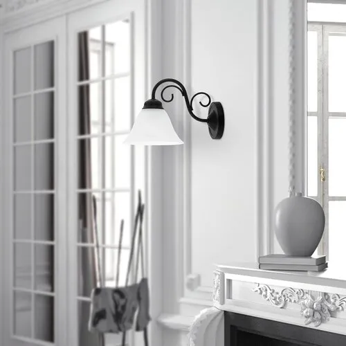 Klasszikus megjelenésű fali lámpa, matt fekete színű, kovácsoltvas jellegű, fém lámpatesttel és fehér alabástromüvegbúrával. E14-es foglalatú, maximum 40W teljesítményű, halogén vagy LED fényforrással is használható. Kialakításának köszönhetően a fényforrás cseréje, illetve a lámpatest tisztítása gyorsan és egyszerűen elvégezhető.
