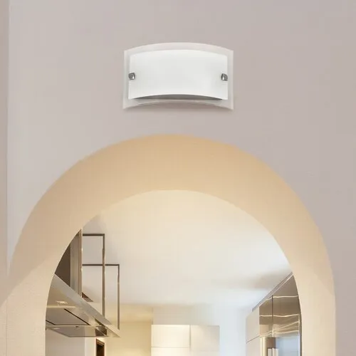 Modern stílusú fali lámpa 1 db foglalattal és beépített kapcsolóval. 20 cm széles, 11,5 cm magas, szatin króm színű, fém test és íves, opálfehér üveg lámpabúra szatin króm színű rögzítőcsavarokkal. A lámpatest E14-es foglalatkialakítású, max. 40W teljesítményű energiatakarékos fényforrással is használható.