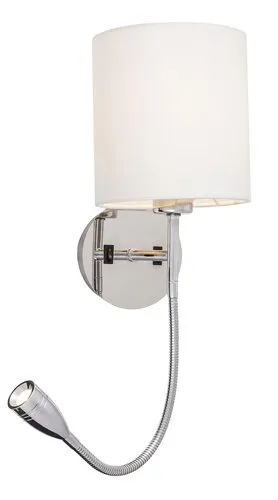 Modern megjelenésű, olvasófejes fali lámpa beépített energiatakarékos LED fényforrással. Az olvasófej gégecsöve állítható, pozícionálható. 20,5 cm a faltól mért távolsága, 50 cm magas, króm színű, fémből készített lámpatest és natúr színű, textil lámpabúra, integrált kapcsolókkal. Az olvasófejbe beépített LED fényforrás A+ energiaosztályú besorolás és 3W teljesítmény mellett 205 lumenes fényerőt és 2800 Kelvines, melegfehér színű fényt biztosít. A falikar E27-es foglalatú, max. 40W teljesítményű energiatakarékos fényforrással is használható. 5 év garanciával. A pozícionálható olvasófejben a fényforrás nem cserélhető.