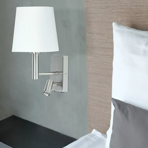 Modern megjelenésű, olvasófejes fali lámpa beépített energiatakarékos LED fényforrással. 21 cm kinyúlású, 36 cm magas, szatin króm színű, fémből készített lámpatest és fehér színű, textil lámpabúra, integrált kapcsolókkal. Az olvasófejbe beépített LED fényforrás A+ energiaosztályú besorolás és 3W teljesítmény mellett 180 lumenes fényerőt és 2800 Kelvines, melegfehér színű fényt biztosít. A falikar E-27-es foglalatú, max. 40W teljesítményű energiatakarékos fényforrással is használható. A pozícionálható olvasófejben a fényforrás nem cserélhető.