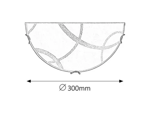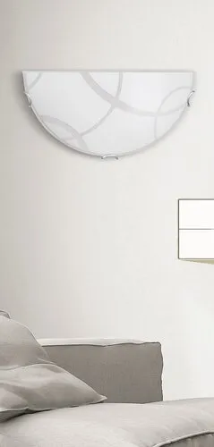 30 cm átmérőjű, modern megjelenésű fali lámpa, fém és műanyag szerkezettel, mintás lámpabúrával, fehér alapszínben, króm színű rögzítőkörmökkel. E27-es foglalatú, maximum 60W teljesítményű, halogén vagy LED fényforrással is használható.