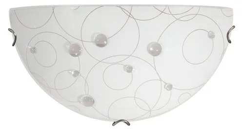 30 cm átmérőjű, hagyományos fali lámpa, fém és műanyag szerkezettel, kiváló minőségű, üveggyöngyözött, fehér alapszínű, inda mintás lámpabúrával. E27-es foglalatú, maximum 60W teljesítményű, halogén vagy LED fényforrással is használható.