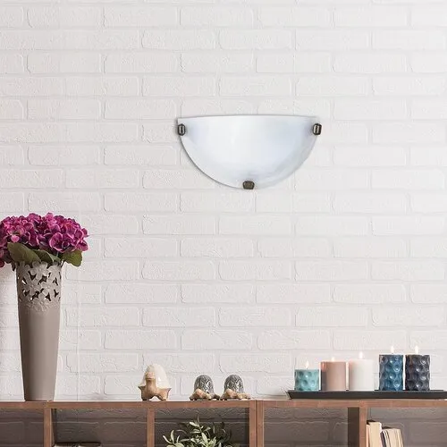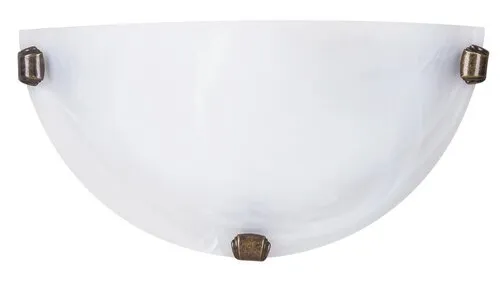 Hagyományos stílusú fali lámpa, 30 cm széles, fém és műanyag szerkezettel, kiváló minőségű, vastag, fehér alabástromüveg lámpabúrával, bronz színű rögzítő körmökkel. E27-es foglalatú, maximum 60W teljesítményű, halogén vagy LED fényforrással is használható.