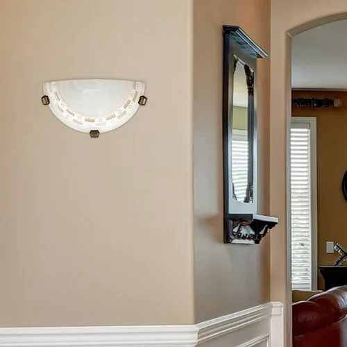 30 cm átmérőjű, mediterrán megjelenésű fali lámpa. Fém és műanyag szerkezet vastag, mintás alabástromüveg lámpabúrával és bronz színű körmökkel. E27-es foglalatú, maximum 60W teljesítményű, halogén vagy LED fényforrással is használható.