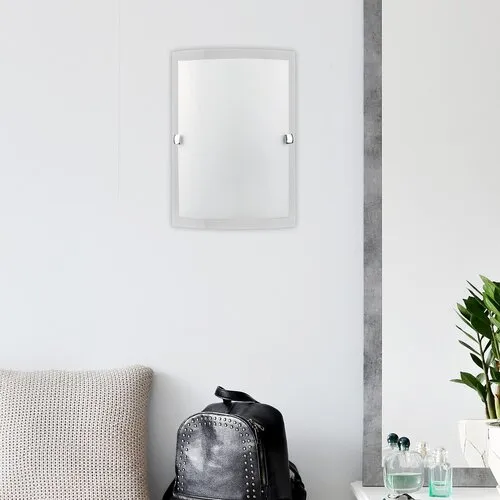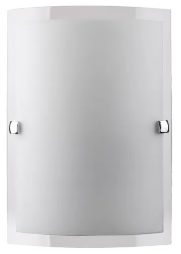 Modern megjelenésű fali lámpa 1 db foglalattal. 18 cm széles, 26 cm magas, fémből készített test fehér opálüveg lámpabúrával és króm színű rögzítő csavarokkal. A lámpatest E27-es foglalatkialakítású, max. 60W teljesítményű energiatakarékos fényforrással is használható.