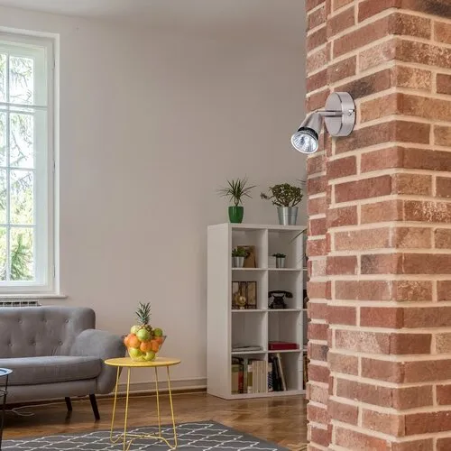 Időtlen megjelenésű fali spotlámpa 1 db foglalattal. 11 cm magas, szatin króm színű, fémből készített lámpatest és pozícionálható lámpabúra. A lámpatest GU10-es foglalatkialakítású, max. 50W teljesítményű energiatakarékos fényforrással is használható.