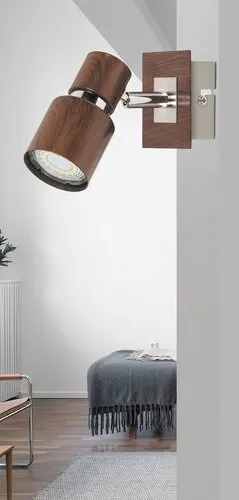 Modern megjelenésű fali spotlámpa 1 db foglalattal. 11,5 cm magas, wenge színű, fémből készített lámpatest és pozícionálható lámpabúra. A lámpatest GU10-es foglalatkialakítású, max. 50W teljesítményű energiatakarékos fényforrással is használható.