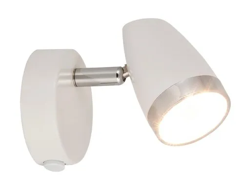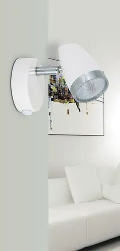 Modern megjelenésű, falra szerelhető spotlámpa beépített energiatakarékos LED fényforrással és hálózati kapcsolóval. 10 cm magas, fehér és króm színű, fémből és műanyagból készített lámpatest pozícionálható lámpabúrával. A beépített LED-es lámpa teljesítménye 4 W, melyhez 280 lumen fényerő társul. Színhőmérséklete melegfehér (3000 Kelvin). 5 év garanciával. A lámpatestben elhelyezett fényforrás nem cserélhető.