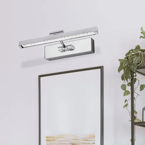 Modern megjelenésű képmegvilágító fali lámpa 29,5 cm széles kivitelben. Króm színű fém vázú. A beépített, fix helyzetű LED fényforrás teljesítménye 5W, melegfehér színéhez (3000 Kelvin) 300 lumen fényerő társul. 5 év garanciával.