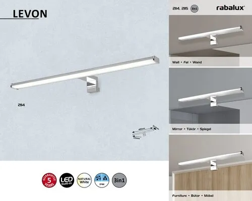 A modern formatervezésű Levon fürdőszobai fali lámpa króm színével szinte bármely fürdőszoba elegáns kiegészítője lehet. Levon lámpánk különlegessége, hogy nemcsak falra, hanem fürdőszobabútorra vagy akár a mosdókagyló feletti tükörre is felszerelhetjük, így világítva be természetes fehér fénnyel a helyiséget. A fali lámpa beépített, energiatakarékos LED fényforrással rendelkezik. A LED fényforrás teljesítménye 8 W, fényereje 560 lumen, színhőmérséklete 4000 K. A lámpa élettartama kiemelkedően hosszú, mintegy 30 000 óra. A fémből készült modell IP44-es védettséggel rendelkezik, ami garantálja, hogy legfeljebb 1 mm átmérőjű tárgyak behatolása ellen, valamint bármilyen irányból fröccsenő víz ellen védett. A Levon lámpa méretei a következők: hossza 400 mm, magassága 52,5 mm, faltól mért távolsága 125 mm. A Levon fürdőszobai lámpára 5 év garanciát vállalunk.