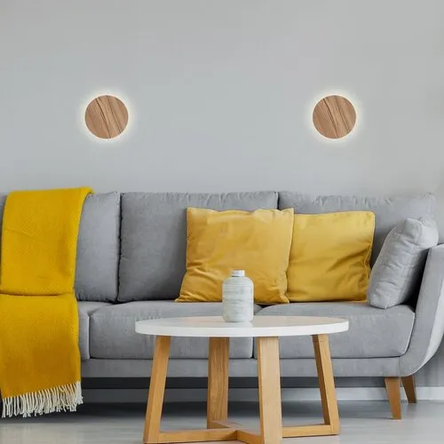 A Marlon indirekt fali lámpa kitűnő választás, ha diszkrét, hangulatos megvilágítást szeretnénk lakásunk valamely helyiségébe. A Marlon meleg fehér fényének segítségével kellemes hangulatot varázsolhatunk a nappaliba, a hálószobába vagy az étkezőbe. A tölgy színű, minimál stílusú lámpa anyaga fém és fa. A Marlon fali lámpa beépített, energiatakarékos LED fényforrással rendelkezik. A fényforrás energiafogyasztása 8 W, fényereje 640 lumen, színhőmérséklete 3000 K, élettartama nem kevesebb, mint 30 000 óra. A lámpa átmérője 180 mm, faltól való távolsága 35 mm. A Marlon indirekt fali lámpára 5 év garanciát biztosítunk.