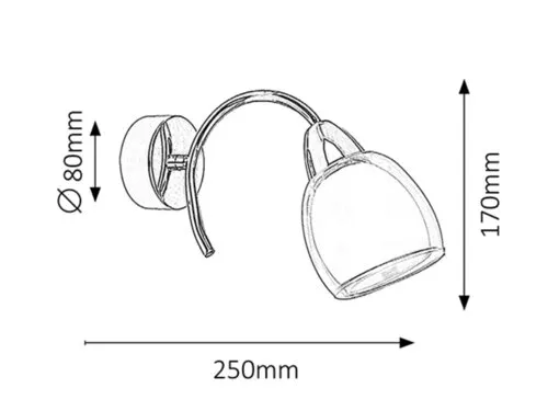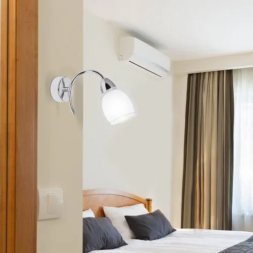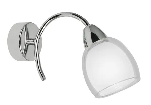 Modern megjelenésű fali lámpa 1 db foglalattal. 15,5 cm magas, 26 cm kinyúlású, króm színű fém lámpatest valamint fehér és áttetsző színkombinációjú üveg lámpabúra. A lámpatest E-14-es foglalatú, max. 40W teljesítményű energiatakarékos fényforrással is használható.