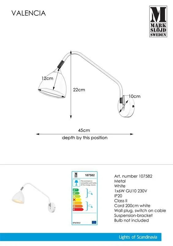 Markslöjd VALENCIA fali lámpa 1L fehér