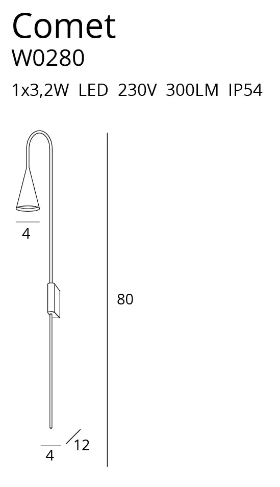 Moc/Power: 1 x 3,2W LED 230V, 300LM 3000K, IP54_x000D_ W: 4 cm, D: 12 cm, H: 80 cm,_x000D_ Wykończenie/Detail finishing: czarne/black_x000D_ Materiał/Material/: metal, akryl/metal, acrylic_x000D_ Led w komplecie/LED included 3000K_x000D_ Transformator w komplecie/ LED driver included