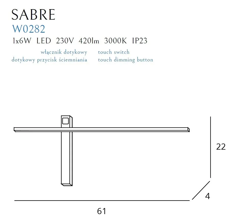 Moc/Power: 1 x 6W LED 230V, 420 LM, CRI90 3000K, IP23 W: 61 cm, D: 4 cm, H: 22 cm Wykończenie/Detail finishing: białe/white Materiał/Material/: metal, akryl/metal, acrylic Zasilacz + LED ściemnialny w komplecie/ dimmable LED + driver included posiada włącznik dotykowy ściemnialny/ includes dimmable touch switch