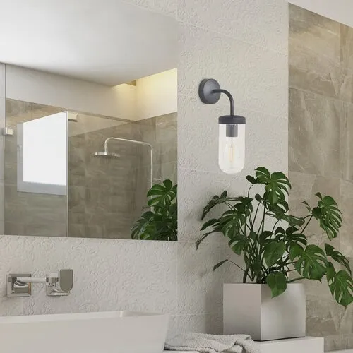 A modern stílusú Yago fürdőszobai fali lámpát elsősorban a mosdóhoz tartozó tükör fölé ajánljuk, de elhelyezhetjük akár a teraszon is vagy máshol a ház külső falán. A matt fekete alumínium lámpatestből és henger alakú, átlátszó üvegbúrából álló modell egy darab, legfeljebb 60 W teljesítményű fényforrással használható, a foglalat típusa E27. A Yago kerek, fekete dísztalp segítségével rögzíthető a falra. A lámpa IP44-es védettsége garantálja, hogy legfeljebb 1 mm átmérőjű tárgyak behatolása ellen, valamint bármilyen irányból fröccsenő víz ellen védett. A fürdőszobai fali lámpa méretei a következők: szélessége 97 mm, magassága 325 mm, faltól mért távolsága 170 mm, beépítési átmérője 90 mm. Ezt a modellt fényforrás nélkül szállítjuk.