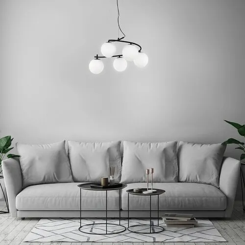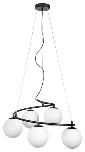 Az indusztriális stílus képviselői közé tartozó Aslan ötös függeszték látványos kiegészítője lehet modern nappalinknak vagy hálószobánknak. A fémből készült, matt fekete lámpatestet fehér üvegbúrák egészítik ki, amelyek úgy függnek a félköríves lámpatesten, mint öt fehér léggömb. A függeszték kisméretű, kerek dísztalp segítségével rögzíthető a mennyezeten. A gömb alakú búráknak köszönhetően ez a modell minden irányban szabadon szórja a fényt, hangulatos megvilágítást biztosítva a szobában. Az Aslan öt darab, egyenként legfeljebb 5 W teljesítményű fényforrással használható, a foglalatok típusa E14. Ha a meghitt, otthonos hangulatot szeretnénk erősíteni, válasszunk a lámpához meleg fehér fényű fényforrásokat. Az Aslan függeszték méretei a következők: átmérője 560 mm, belógása 1200 mm, beépítési átmérője 120 mm. Ezt a modellt fényforrások nélkül szállítjuk.